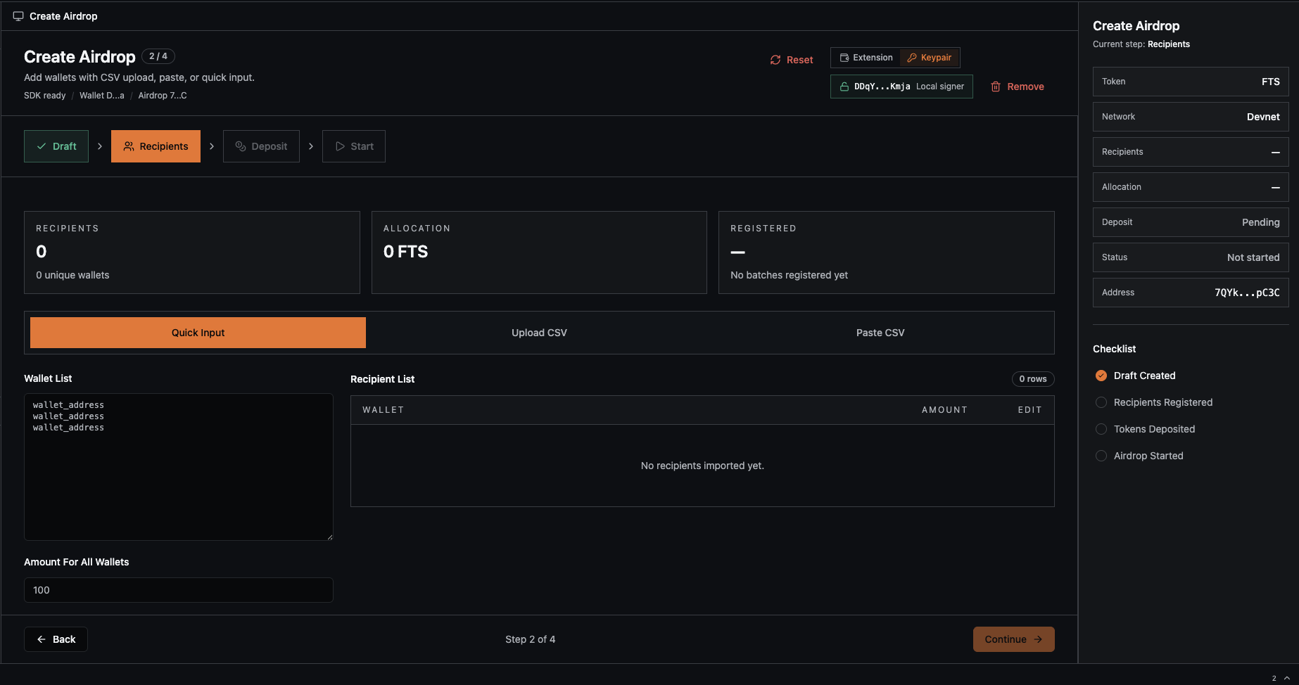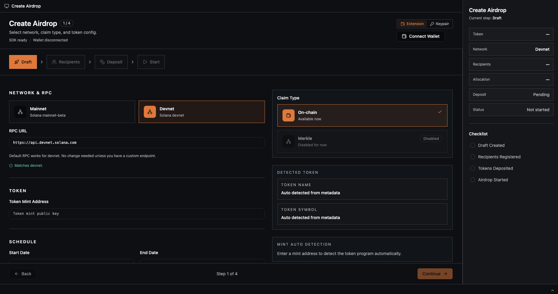 Airdrop creation mutates on-chain state. Start on devnet when you are trying the flow for the first time.