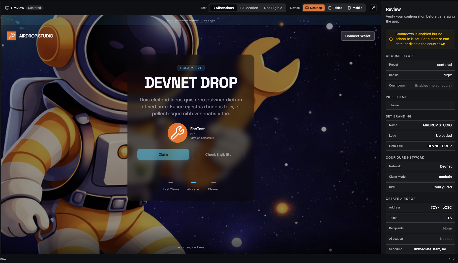 airdrop-studio ./my-campaignThe studio reads .bonkit/workspace.json, rehydrates every section, and lets you regenerate the app with updated settings.