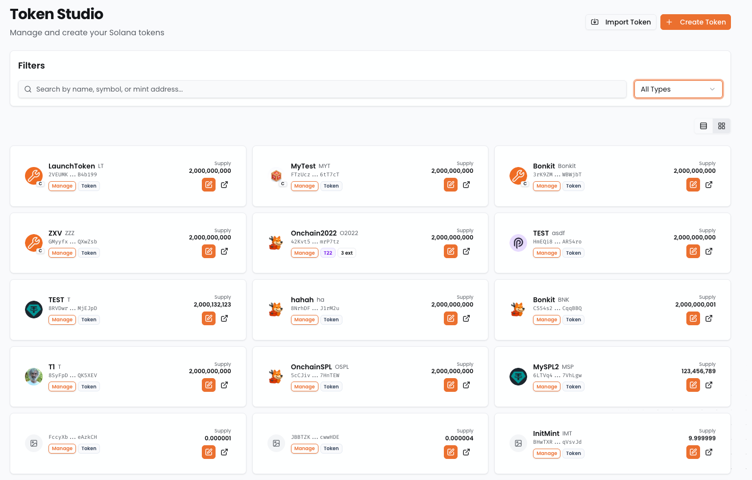 - Tokens appear as cards with supply, program, and manageability badges
