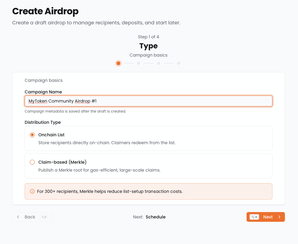 Onchain Listwhen the campaign has500recipients or fewer. UseClaim-based (Merkle)when it has more than500. - Use