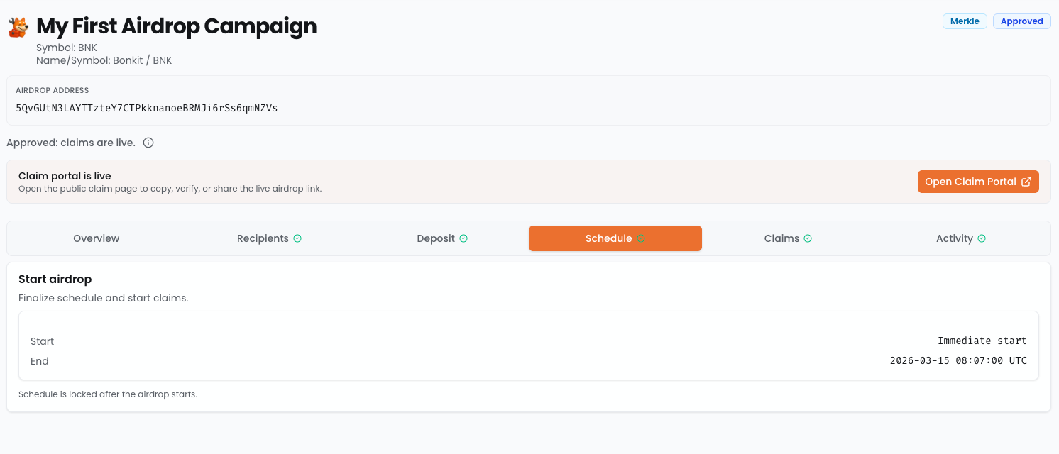 Claim-based (Merkle)is the recommended path when the eligible dataset has more than500recipients and you want proof-based verificationLaunch and Monitoringgives you a way to track whether eligible users are actually claiming